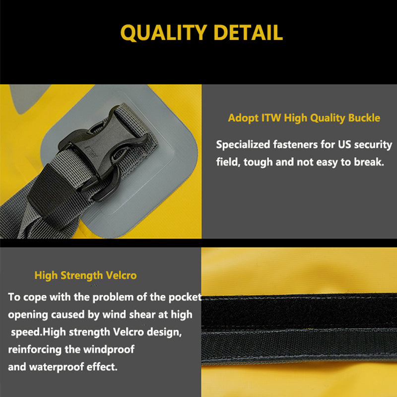 • Fully Sealed & Waterproof: The bag body utilizes an overall seamless welded construction, combined with high-strength Velcro and ITW quality buckles to resist wind shear and ensure a dry interior.
