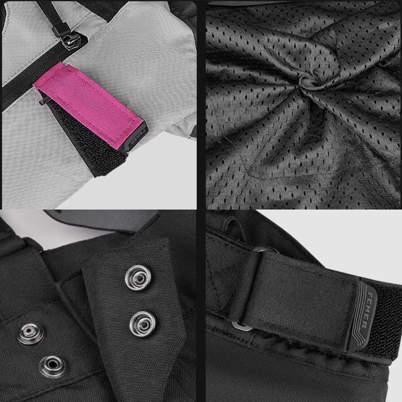 Discover the FEHER JK-060 Women's Riding Pull Suit – your ultimate companion for safe and comfortable riding in all seasons. Designed with multi-directional CE-certified protection (including CE2 shoulder and elbow guards, CE1 chest, back, and knee protectors), this suit ensures maximum safety without compromising mobility. The innovative breathable system with moisture-wicking technology keeps you dry, while the waterproof and windproof inner liners adapt to changing weather conditions. Reflective strips enhance visibility for night rides, and adjustable straps with secure zippers offer a custom fit. Available in stylish Pink Blue and Gold Black, and sizes S to 3XL. Ride confidently with FEHER – where safety meets style.